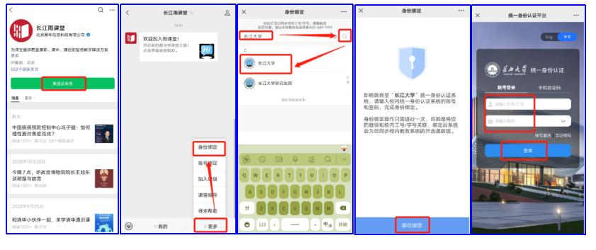 身份认证(如果已完成身份认证,请略过此步骤):登录平台前,请先在“长江雨课堂”微信公众号内进行身份绑定-选择学校:长江大学。