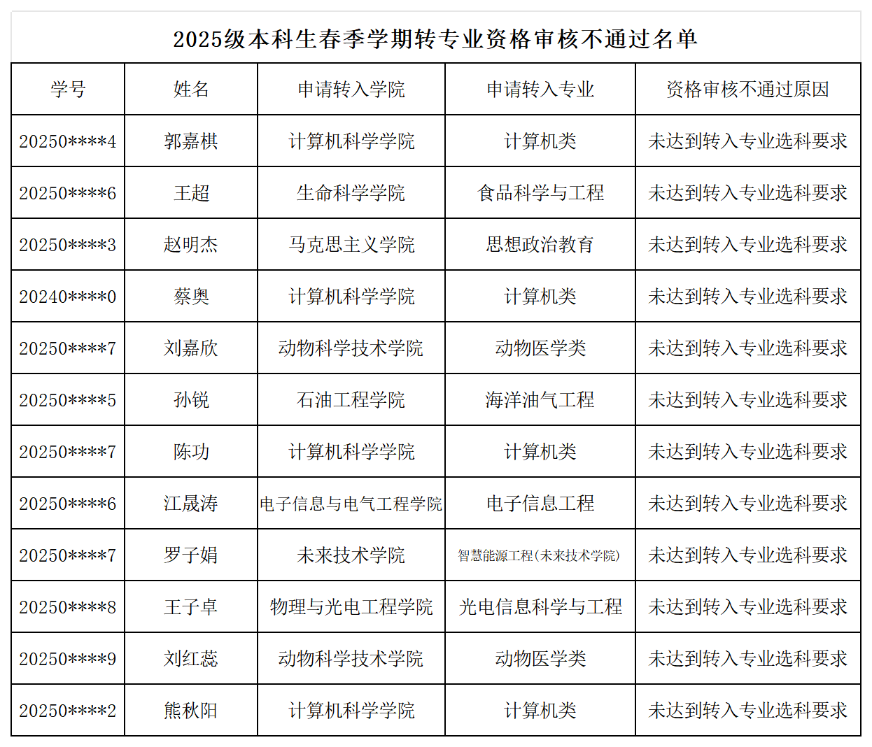 根据《长江大学普通本科生专业分流与转专业管理办法(试行)》(长大校发〔2019〕260号)精神和《关于开展2025级普通本科生春季学期转专业工作的通知》相关要求,经学生本人申请,所在学院(部)、本科生院资格审核,现将2025级本科生春季学期转专业资格审核情况予以公示(见附表)。