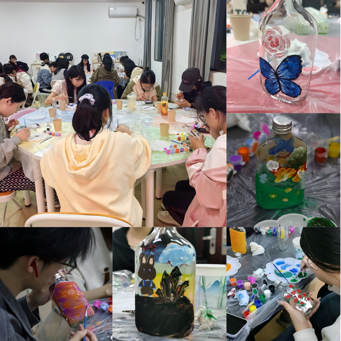 伴着舒缓的音乐,同学们开始构思自己作画的风格与色调。随着手中的画笔与颜料在瓶身上跳跃,大家把自己对美的理解寄托于本次创作。在欢声笑语中,蝴蝶、花朵、树木等美丽的意象被勾勒出来,同学们也不知不觉释放了心中压力。