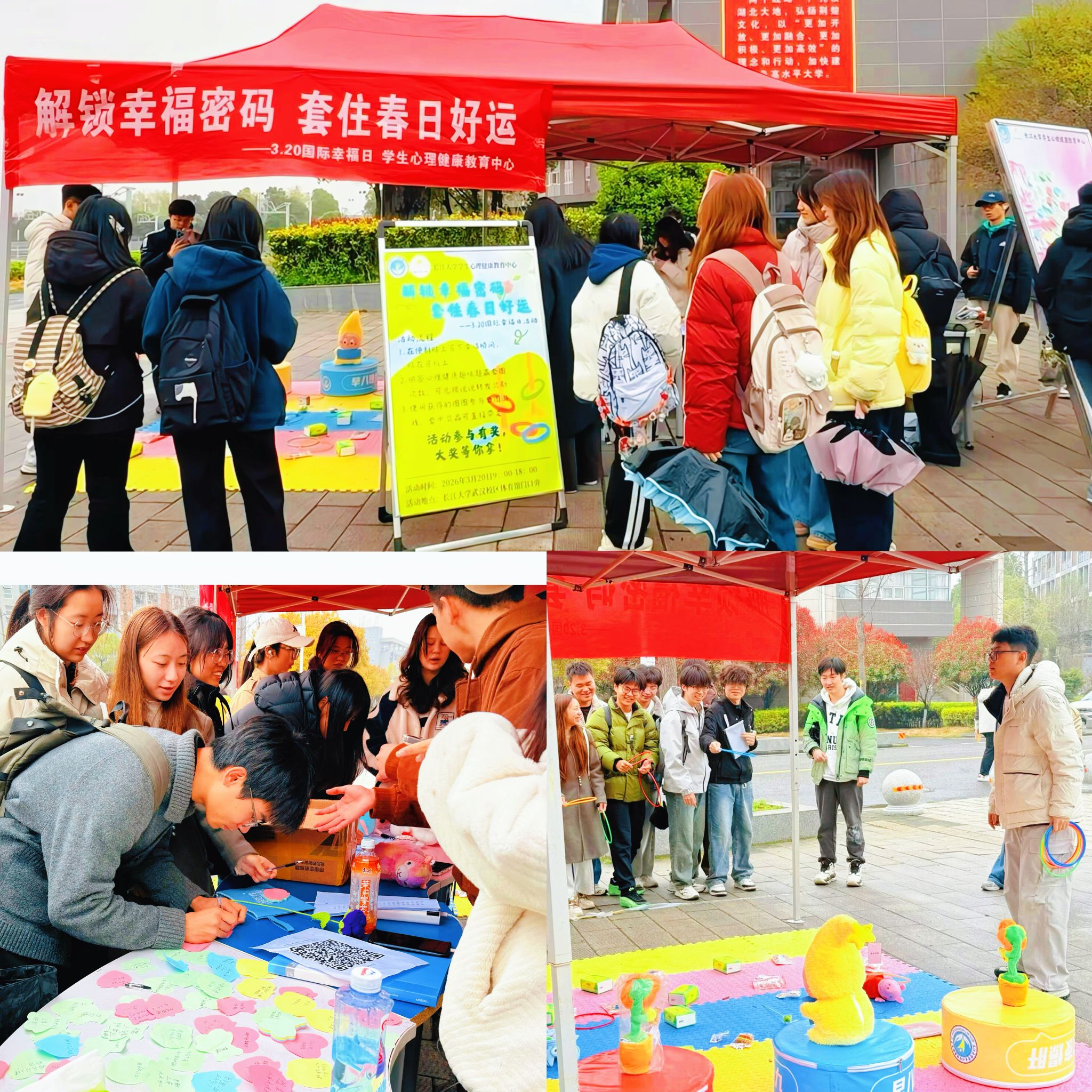 在荆州校区,纵然细雨连绵,以“笺纸书心意,幸福满校园”为主题的趣味活动依然吸引了众多师生参与。“哼唱一首令自己深感幸福的歌曲”“给牵挂的人发送一条温暖的短信”“摆一个惬意的姿势并高喊出‘爱你老己’”……活动现场,师生们或随机抽取“刮刮卡”领取专属任务,在实践中体悟幸福的真谛;或执笔写下自己对幸福的理解,然后将五彩斑斓的便利贴粘于展板;或与卡通玩偶亲密合影,并将今日的幸福感受分享至社交平台。每一次互动、每一份惊喜、每一声欢笑……都构成了春日校园里最明媚的风景。大家不仅收获了精美的礼品与愉悦的心情,更在轻松的氛围中增长了对心理健康的认知,提升了个人情绪调适能力。