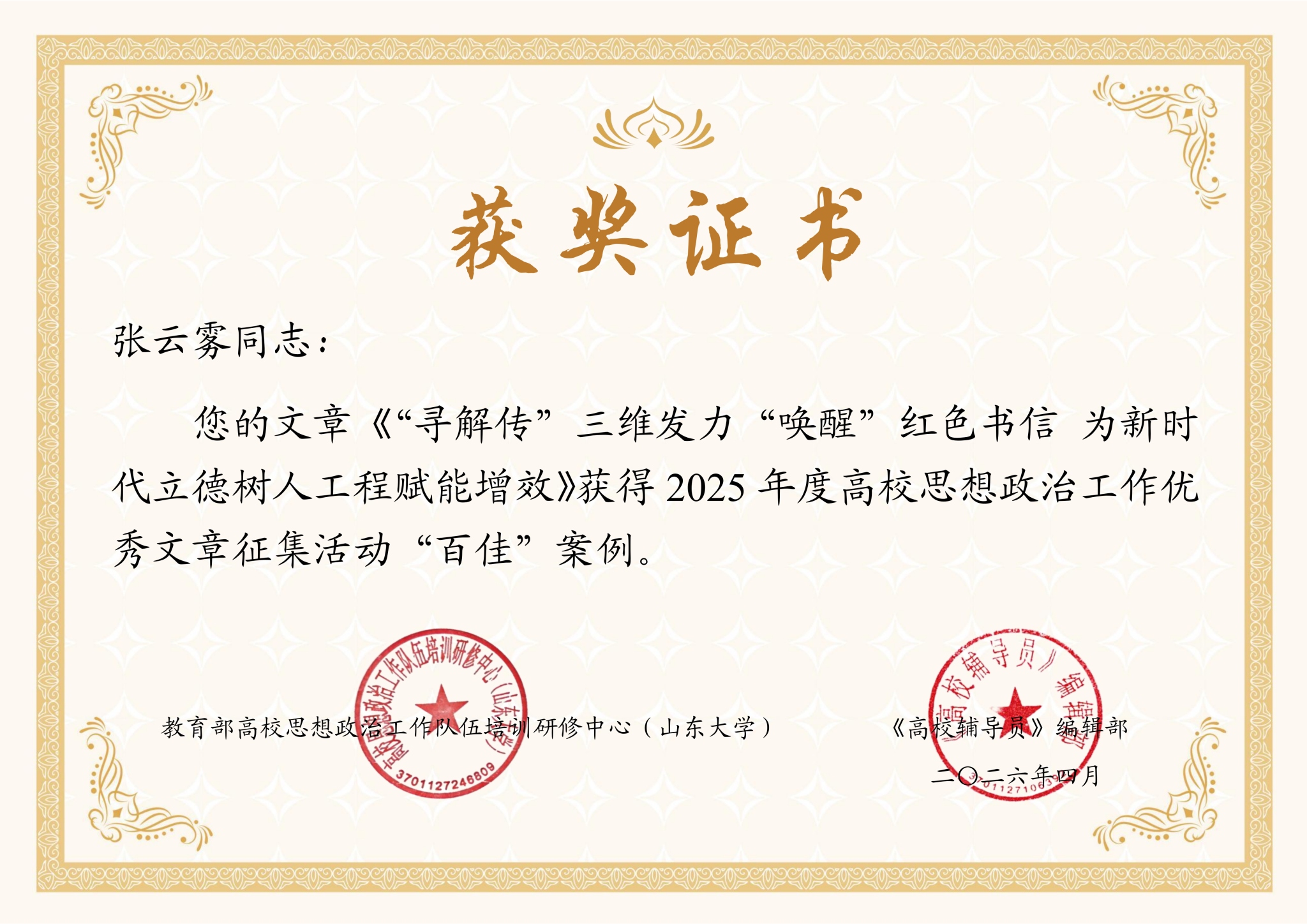 (通讯员 蒋毅)近日,教育部高校思想政治工作队伍培训研修中心(山东大学)、《高校辅导员》编辑部公示“2025年高校思想政治工作优秀文章征集活动”评选结果。我校马克思主义学院辅导员张云雾老师撰写的《“寻解传”三维发力“唤醒”红色书信 为新时代立德树人工程赋能增效》工作案例,成功获评全国“百佳”案例。