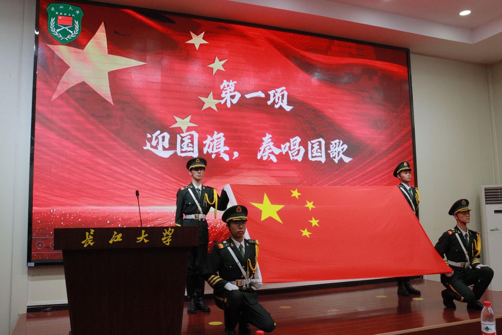 大会在雄壮的国歌声中拉开帷幕。全体肃立,迎国旗、奏唱国歌。兄弟高校的祝福视频与第十九届队员的回忆短片先后播放,一句句真挚寄语、一幕幕护旗岁月,浓缩了风雨无阻的坚守与成长。