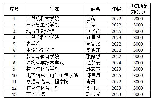 根据《长江大学学生临时困难补助管理办法》(长大校发﹝2017﹞ 188号)的规定,经学生自愿申请,学院(部)审核,党委学生工作部研究决定,拟给予计科学院白萌等13人长江大学临时困难补助,共计人民币叁万捌仟元,现在全校范围公示。