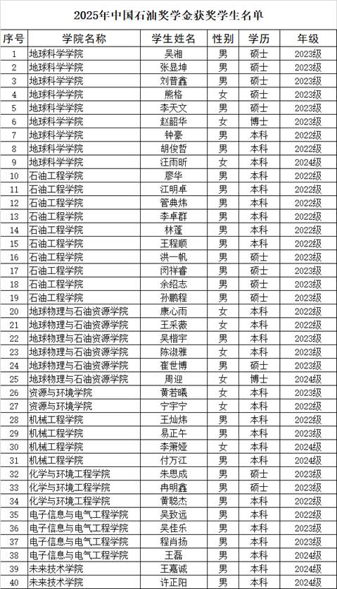 2025年11月,党委学生工作部根据我校与中国石油签订的《中国石油奖学金协议(第五期)》约定,结合我校实际组织启动了2025年中国石油奖学金评选工作,经学生自愿申请、学院评审答辩、学校审核,评审出吴湘等40名2025年中国石油奖学金获奖学生,现将初评名单在全校范围内予以公示。